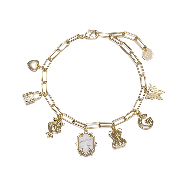 Featuring a blue turquoise surrounded by these pop elements: golden metal alphabet customizable, heart, lock, butterfly, owl, and little bear, the bracelet completes a sense of cute and freedom. It’s easy to wear for its lobster clasp design.