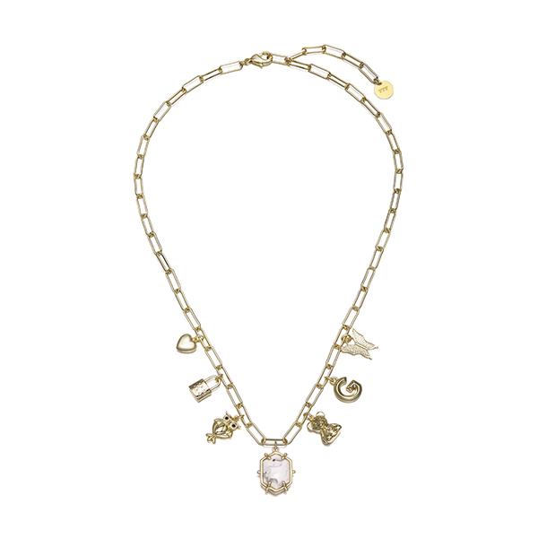 With a blue turquoise surrounded by these pop elements: golden metal alphabet customizable, heart, lock, butterfly, owl, and little bear, the necklace completes a sense of fun and freedom. It’s easy to wear for its lobster clasp design.