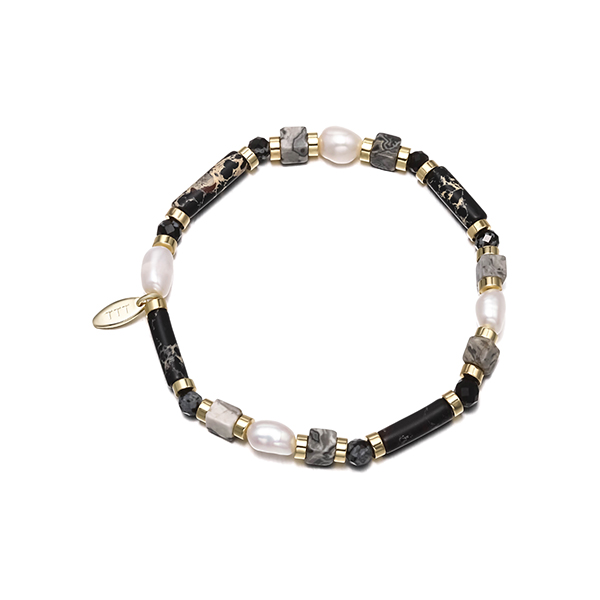 This bracelet is composed of hand-selected natural pearls, brass septa chips, and 3 types of gemstones.