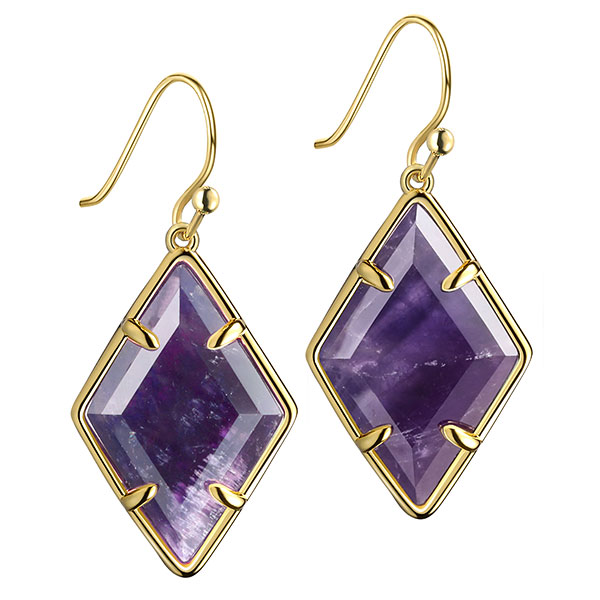 A combination of a classy and elegant look, featuring diamond-shaped natural Amethyst stones in protective bezels on 18K Gold Plated hoops. Gold–plating and natural Amethyst make for a stunning combination.