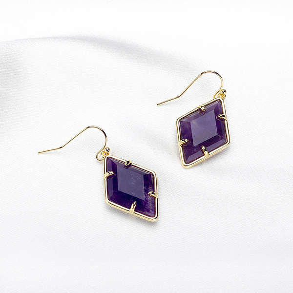 Featuring diamond-shaped natural Amethyst stones, our Gold Amethyst Drop Earrings is the perfect blend of modern and classic styling! The hoops are plated with 18K Gold for authentic luster and shine. Wear it on its own or pair it with other natural stone necklaces for a curated look!