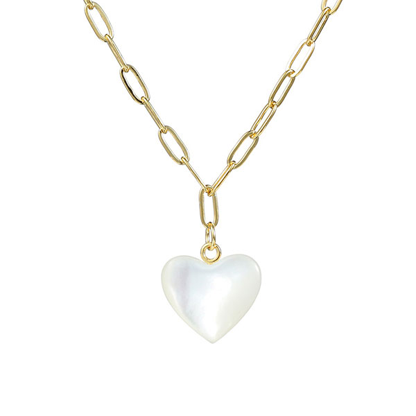 Featuring a lovely heart pendant that is set with a stunning natural White Mussel and hangs from a luxurious 18k Gold Vermeil carrie link chain, this Gold Plated Sterling Silver White Mussel Heart Necklace creates an exciting on-trend look. The silver chain is also available in Platinum Vermeil and is adjustable for a perfect fit. This sterling silver heart pendant necklace is sure to capture every jewelry lover’s heart. Layer it or let it shine on its own!