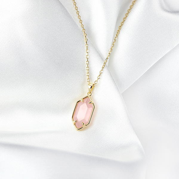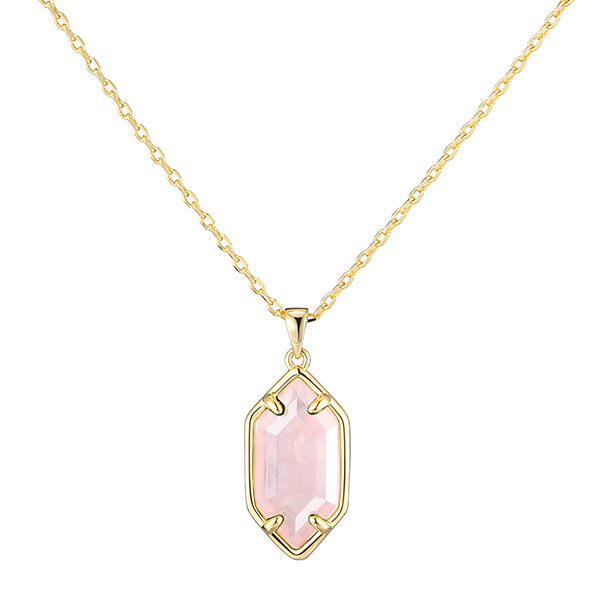 Handcrafted sparkling Gold Pendant Necklace in hexagon-shaped natural Rose Quartz stone can be paired with any look.18K Gold-plating and Rose Quartz combination adds extra glittering shine to any look.