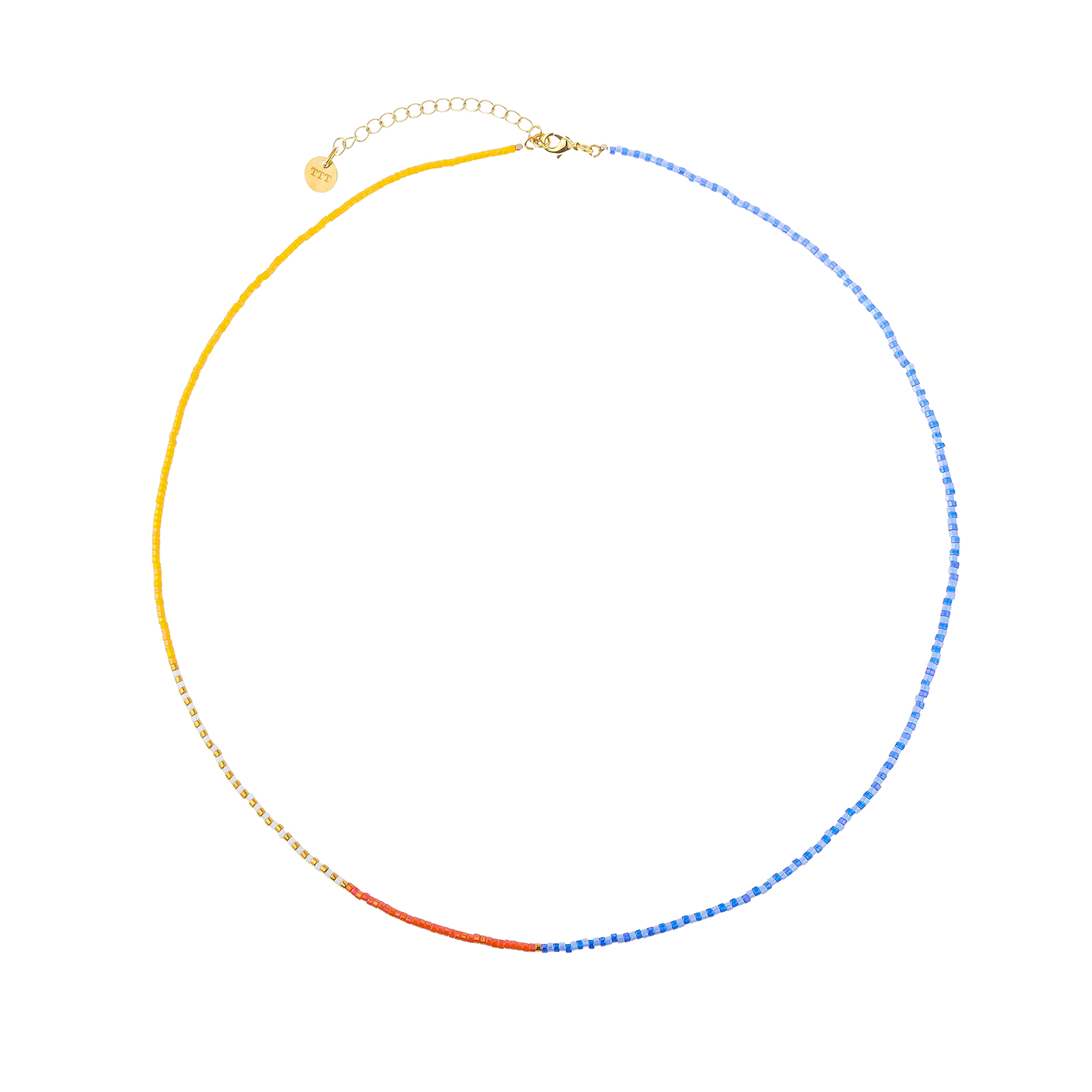 A minimalistic dainty colorful Miyuki beads necklace, featuring TTT’s signature round disc design with beautifully colored seed beads. Orange, yellow, white, gold, blue and light blue make up the color scheme for this striking statement piece. Perfect worn alone or layered with others to light up any looks.