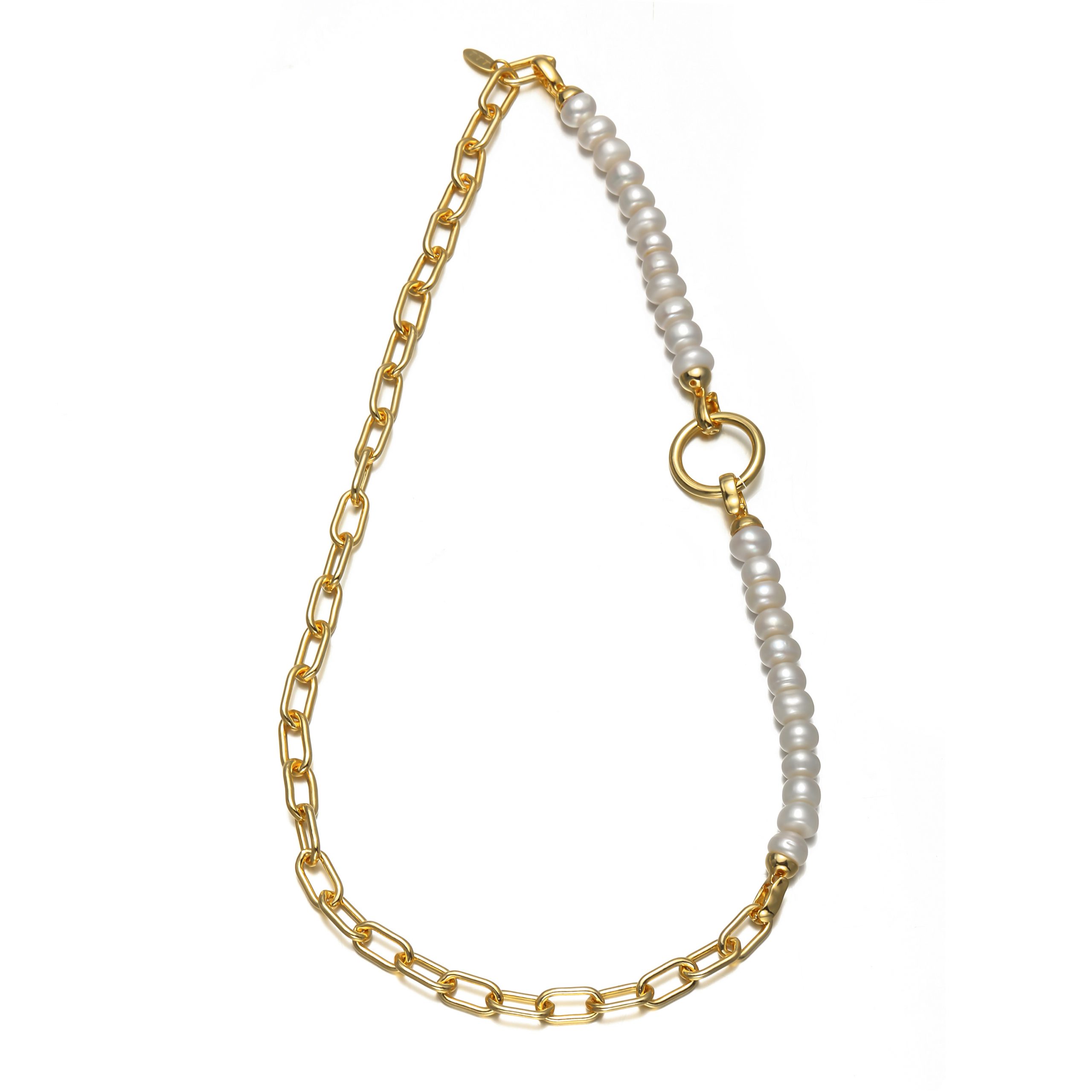 The expert combination of finely crafted link chains and premium freshwater pearls lets it work with any outfit, while the asymmetrical assembly piques the interest of the crowd, making the wearer stand out from everyone else.