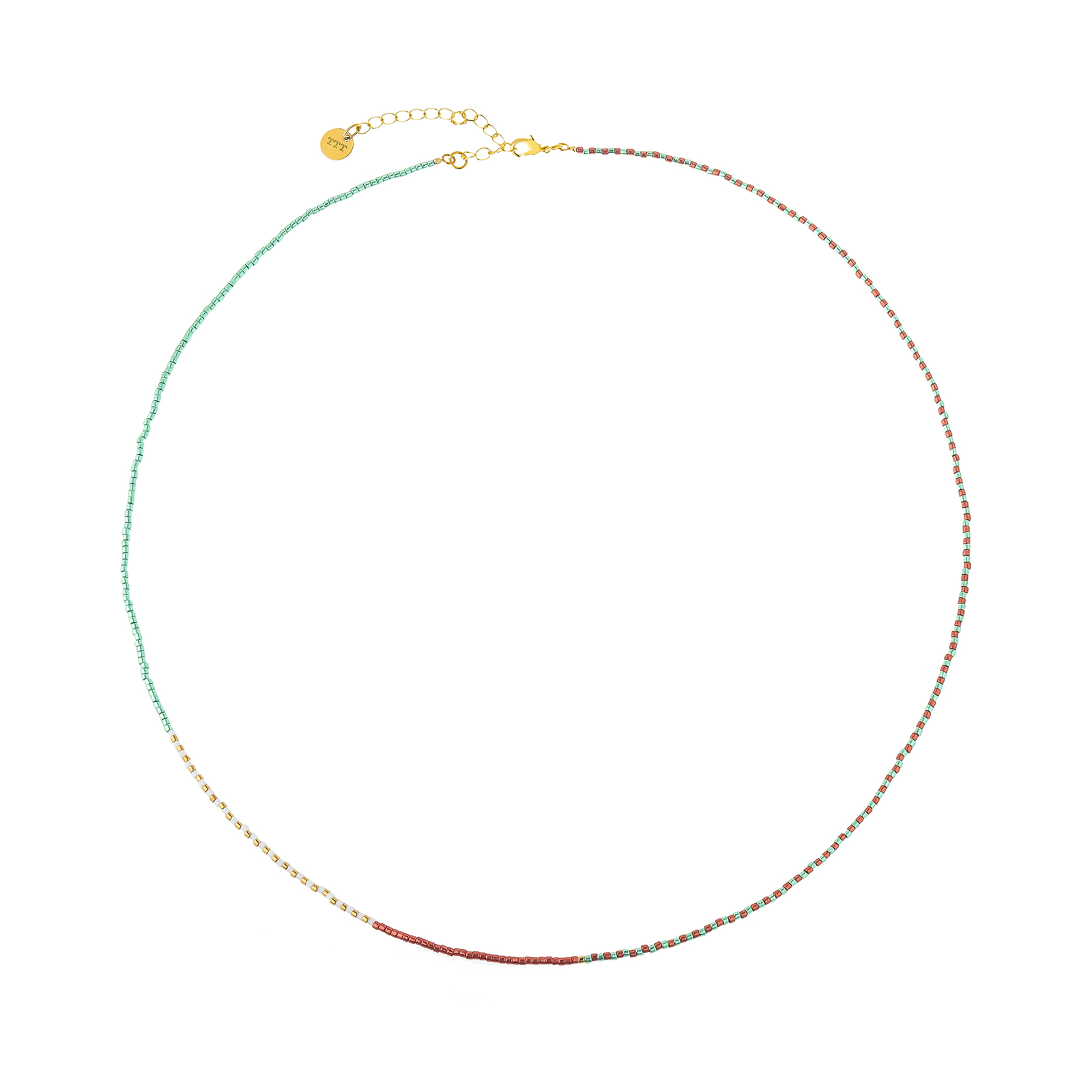 This minimalist Miyuki bead necklace features TTT’s signature round disc design with beautifully colored seed beads. Red ocre, white, gold and pale green make up the color scheme for this striking statement piece. The delicate feel and rich color of Japanese Miyuki beads have made this necklace today’s top trends.