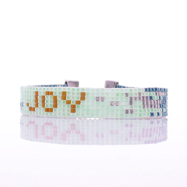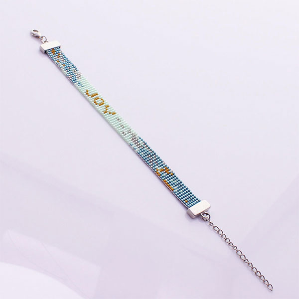 Joyful and colorful, this Miyuki Alphabet Bracelet is handcraft from Japanese Miyuki Delica beads. This letter beaded bracelet is customized with your choice of blue, light green, and ocre letter beads. Whether it’s your brand logo, power phrase, initials, monogram, or a fun expression.