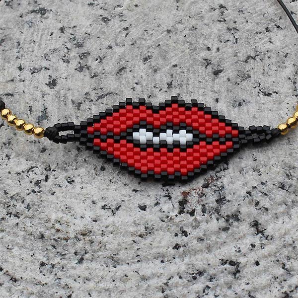 Glamorous and fun adjustable beaded bracelet made with fine, thoughtfully detailed Japanese Miyuki beads. The Miyuki Kiss Bracelet features small and playful gold accents, and handwoven beaded lips charm on an adjustable cord.