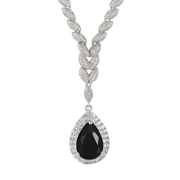 The beautiful pear-cut black onyx stone is set in an eye-catching double-halo setting rendered in Platinum vermeil sterling silver, and the cable chain with elegant leaf design is traced with sparkling cubic zirconia stones, lending a glittering contrast. Closing with an adjustable lobster clasp for secure, confident wear. Request Your FREE Quote Today for a unique custom silver necklace!