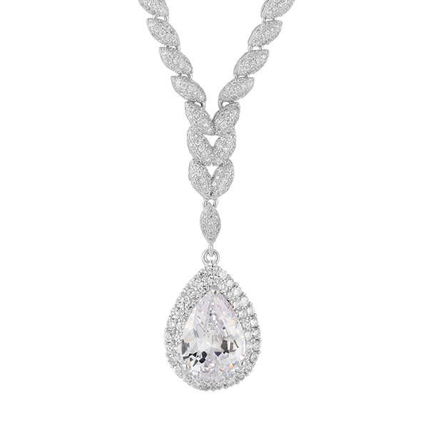 Delicate yet refined the eclectic design of our Sterling Silver Pear Cut Cubic Zirconia Necklace combines a large pear-cut CZ stone with two halos of radiant CZ stones giving this dainty silver necklace a sparkling silhouette. The cable chain with elegant leaf design is traced with scintillating cubic zirconia stones, lending a glittering contrast. Crated in Platinum vermeil sterling silver to ensure the necklace dazzles through the years. Request Your FREE Quote Today!