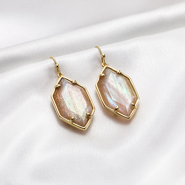 Pair of stunning handmade Gold Drop Earrings. Hexagon-shaped natural Sand Drusy stone on Pink Shell in a bezel on delicate gold-plated hoops. 18K Gold–plating and Sand Drusy combination adds a touch of shine to any look.