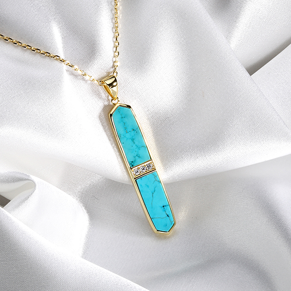 The Gold Pendant Necklace in Blue Turquoise is designed with hand-crafted Cubic Zirconia stones in the center. The necktie shape is one of our one-of-a-kind silhouettes. The chain is plated with 18K Gold for authentic luster and shine. Wear it on its own or pair it with other natural stone earrings for an elevated look!