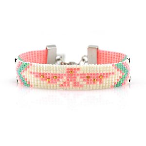 Unique and delicate, this Love Beads Cuff Bracelet is made of gold-plated stainless steel and is set with Japanese Miyuki Delica beads. The color scheme and “love” letter create a playful effect. The carefully detailed beads have a satin look which creates a wonderful glow.