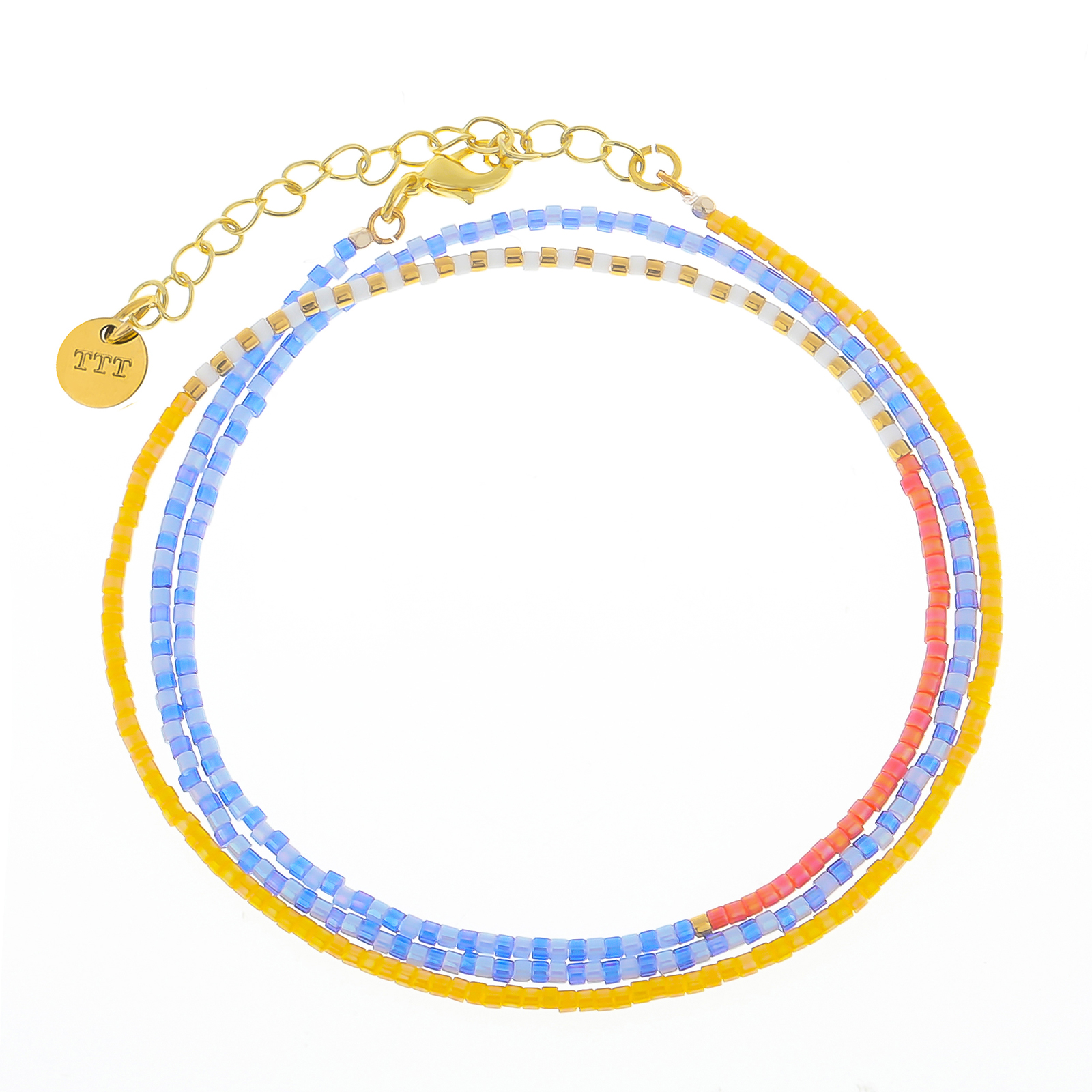 Fun and simple, this Beaded Stacking Bracelet with three layers is made with Japanese Miyuki Delica beads. Handmade Beaded Bracelet comes in rich details of different shaded blue tones; your lovely customers will love this yellow, white, red, and gold color combination, a real eye-catcher.