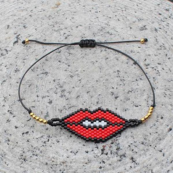 Glamorous and fun adjustable beaded bracelet made with fine, thoughtfully detailed Japanese Miyuki beads. The Miyuki Kiss Bracelet features small and playful gold accents, and handwoven beaded lips charm on an adjustable cord.