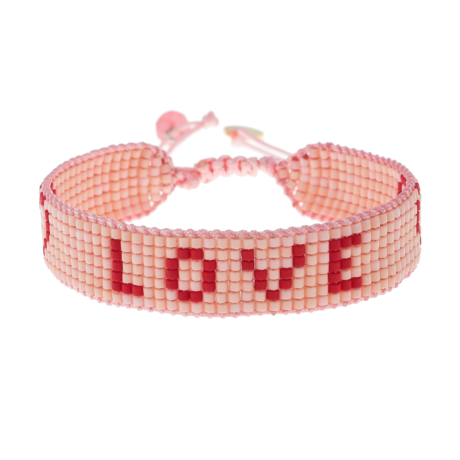 This hand-beaded bracelet is made with the finest Japanese Miyuki beads, this Miyuki Love Bracelet is perfect for adding a touch of playful elegance to any outfit. The lovely combination of pink and red beads is strung up with empowering message.