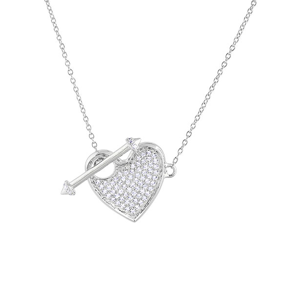 Love and romance are well-themed in this Sterling Silver Cubic Zirconia Heart Arrow Necklace!The platinum vermeil chain suspends a heart pendant that’s accented with pave set sparkling cubic zirconia and pierced by an arrow set with 2 circles of sparkling cubic zirconia. The chain measures 16-inches long with a 2-inch extender and secures with a lobster clasp. Wear this necklace on its own or layered. This feminine style is a firm favorite with the fashion crowd!