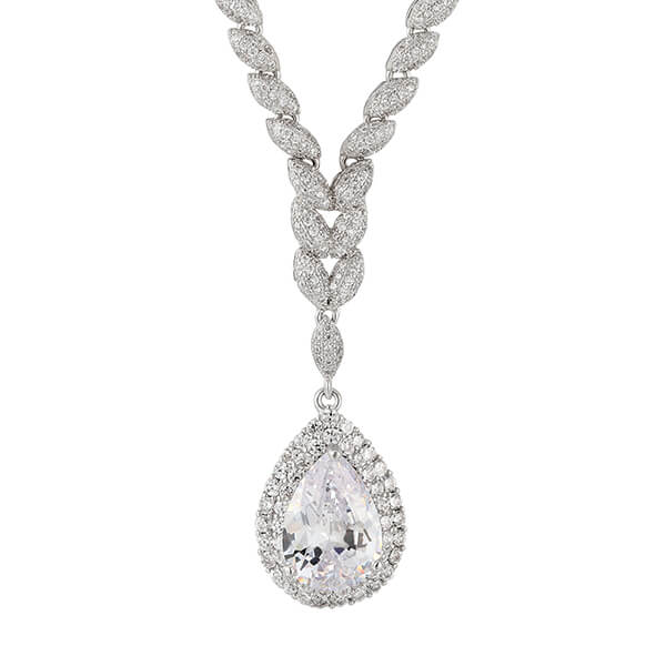 Delicate yet refined the eclectic design of our Sterling Silver Pear Cut Cubic Zirconia Necklace combines a large pear-cut CZ stone with two halos of radiant CZ stones giving this dainty silver necklace a sparkling silhouette. The cable chain with elegant leaf design is traced with scintillating cubic zirconia stones, lending a glittering contrast. Crated in Platinum vermeil sterling silver to ensure the necklace dazzles through the years. Request Your FREE Quote Today!