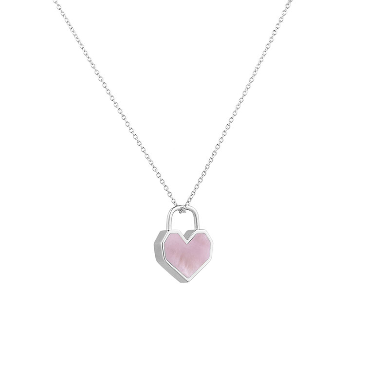 Strung from a delicate chain with a miniature disc detail at the back, this Platinum Vermeil sterling silver necklace features our iconic heart lock crafted from natural rose quartz. The lovely heart lock pendant measures 0.48″ L x 0.43″ and sways from a delicate 17.72-inch chain. The Sterling Silver Rose Quartz Heart Lock Necklace is a perfect mix of elegance, confidence, and femininity with a heart lock design. Layer it or let it shine on its own!