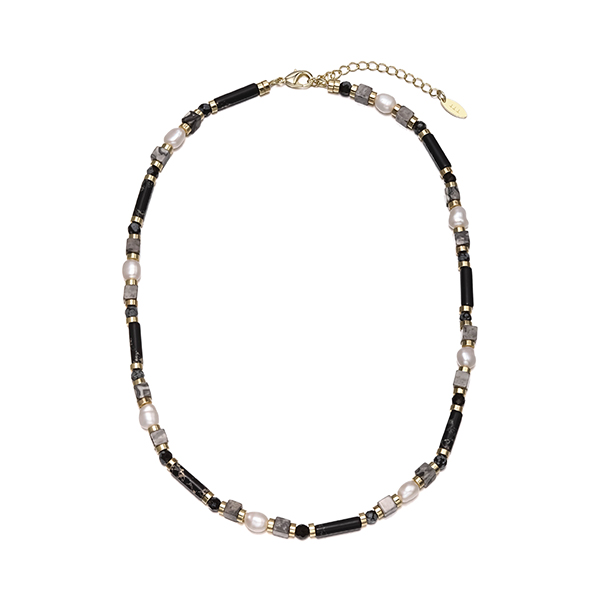 This necklace is composed of hand-selected natural pearls, brass septa chips, and 3 types of gemstones.